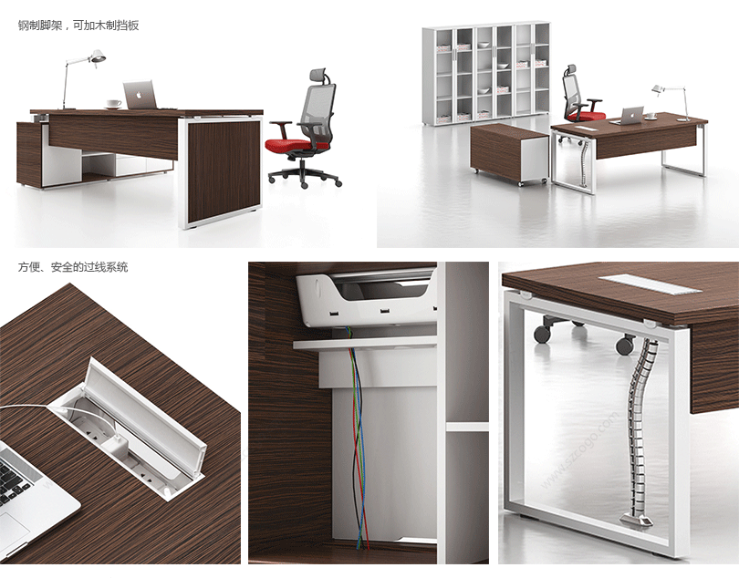 凯撒系列,源自德国的设计风格,糅合木的柔美与刚强的特质,深褐色的睿智理性与白色的纯净空白带来强烈的视觉对比。桌脚部位采用白漆方框金属支撑架,或是装饰或是必须,恰到好处地表现凯撒的艺术姿态。如此,简练高雅的设计,体现出东方华奥现代办公打造的高品位、个性化的办公方式。