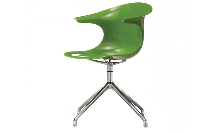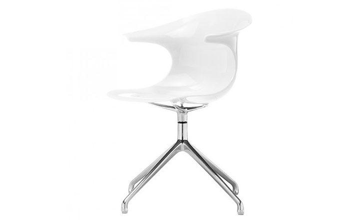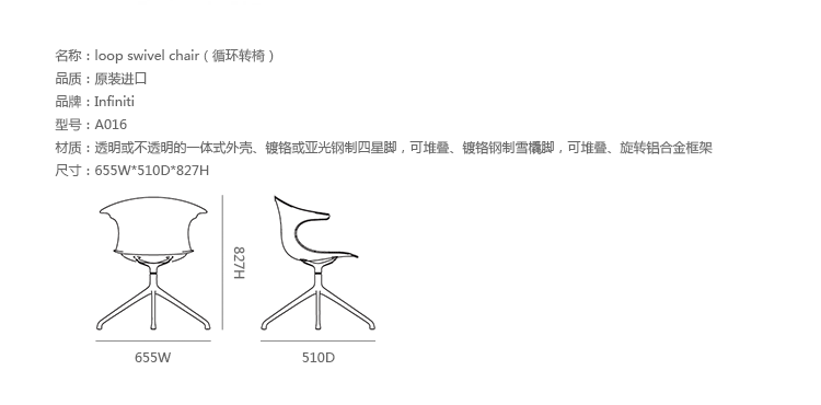Claus Breinholt设计的Loop Swivel Chair(循环转椅)让人充满了惊喜。奇特的造型,优质的材料运用,舒适的人体工学,使它备受欢迎。制作采用透明或不透明的一体式外壳、镀铬或亚光钢制四星脚,可堆叠、镀铬钢制雪橇脚,可堆叠、旋转铝合金框架。
