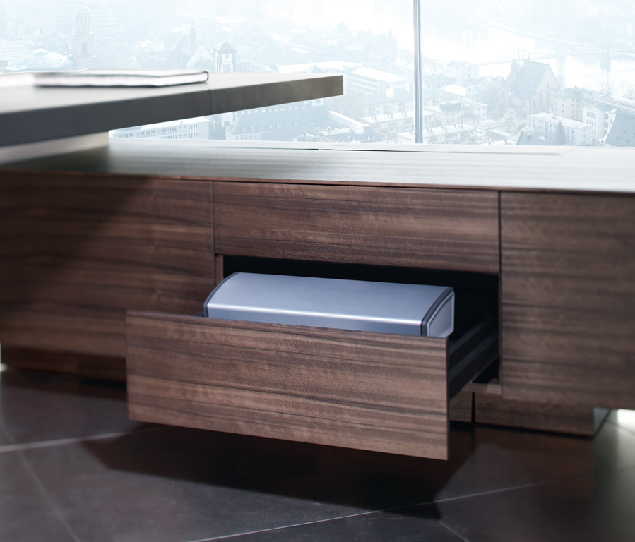 这是EOOS的新总部和会议项目设计团队对该产品强大的美学诉求,比例和维度在优雅的材料的相互作用下给人深刻的印象。在几何基础上,材料的拼贴形成了它的气场。海洋胡桃木饰面可以给你和你的客人带来一种很好的体验;扶手处采用精美的皮革覆盖。由Corian制成的白色方块盖住了集成线盒,看不见的触点是打开的关键。每个设备的连接器都在方块之下,所有的电缆都隐藏在侧板和桌子上,衔接到各种设备。在工作台表面的旁边,一个隐藏的抽屉,里面可以收纳你日常所需的小物件。
