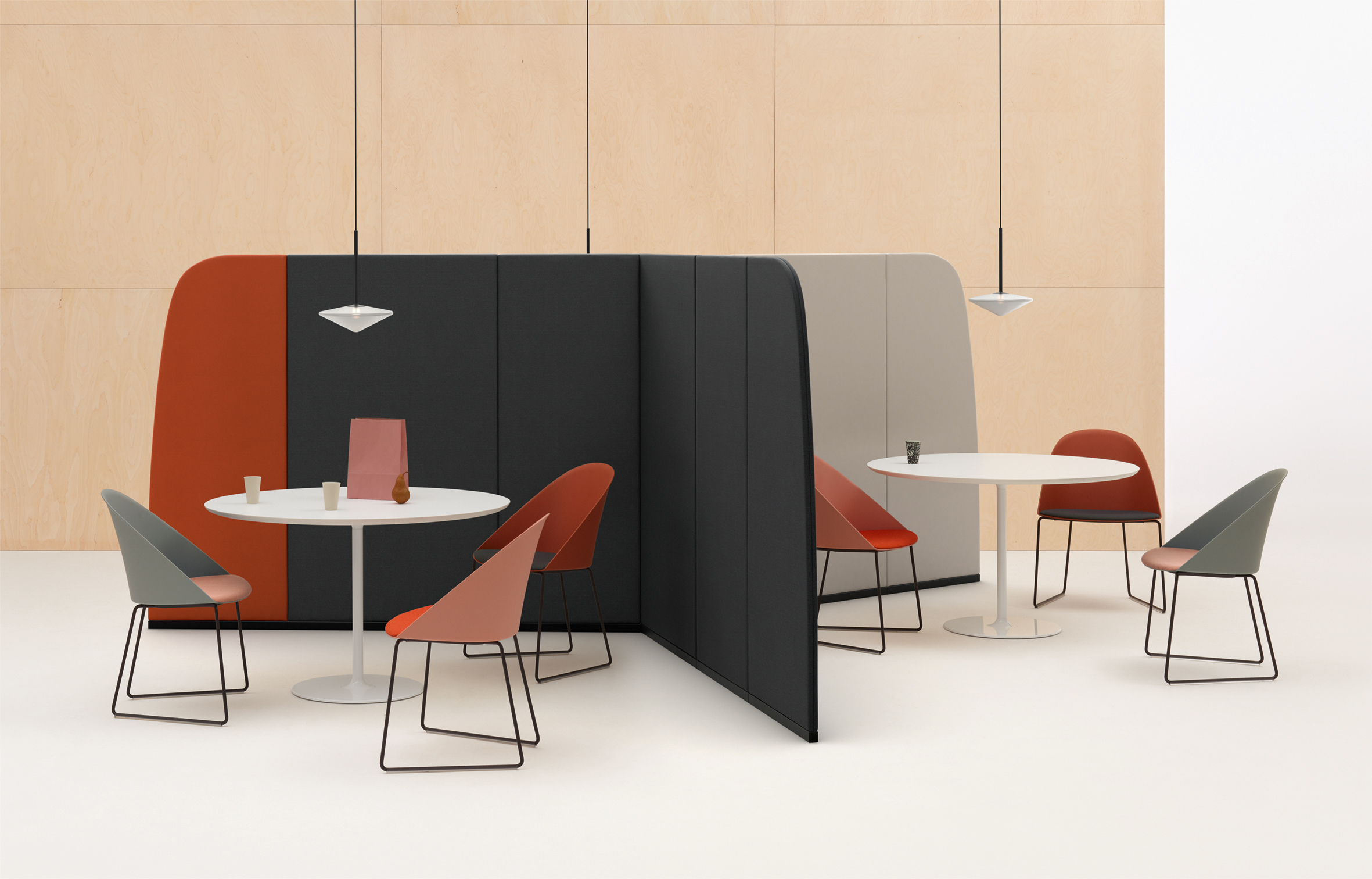 用于定义空间的周长。 Paravan在形式和建筑执行方面具有雕塑感,既清晰又创造空间。像括号一样可以围绕对话,Paravan在开放区域创造亲密感,并采用吸音面板来支持焦点,注意力和协作。