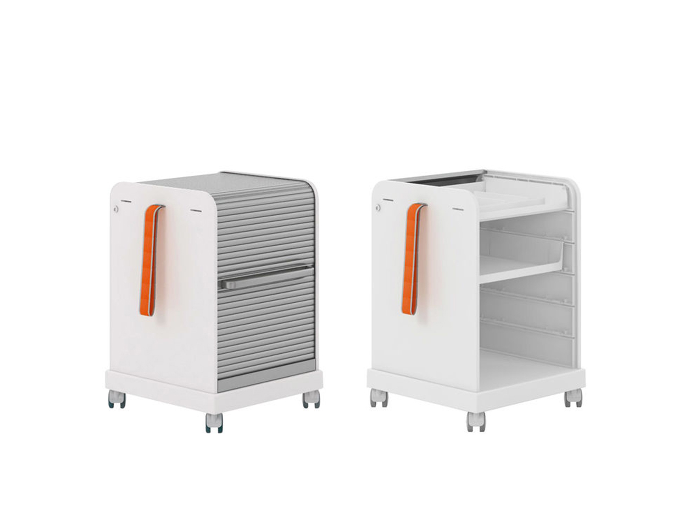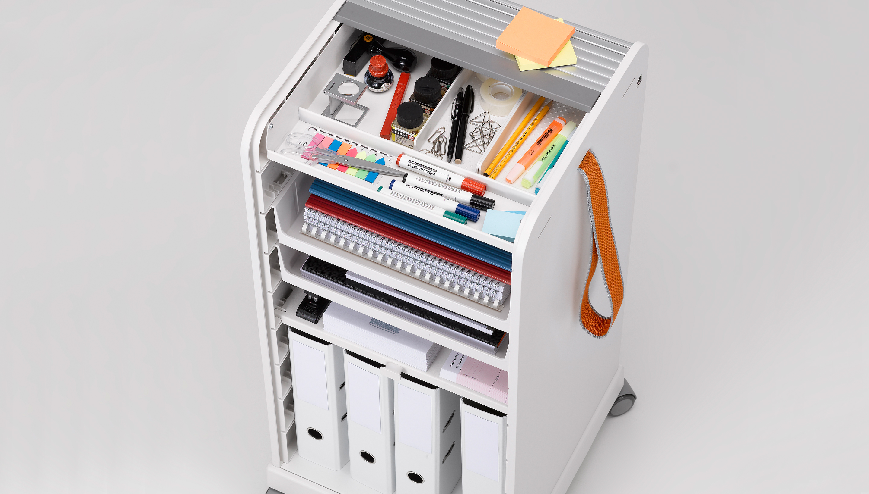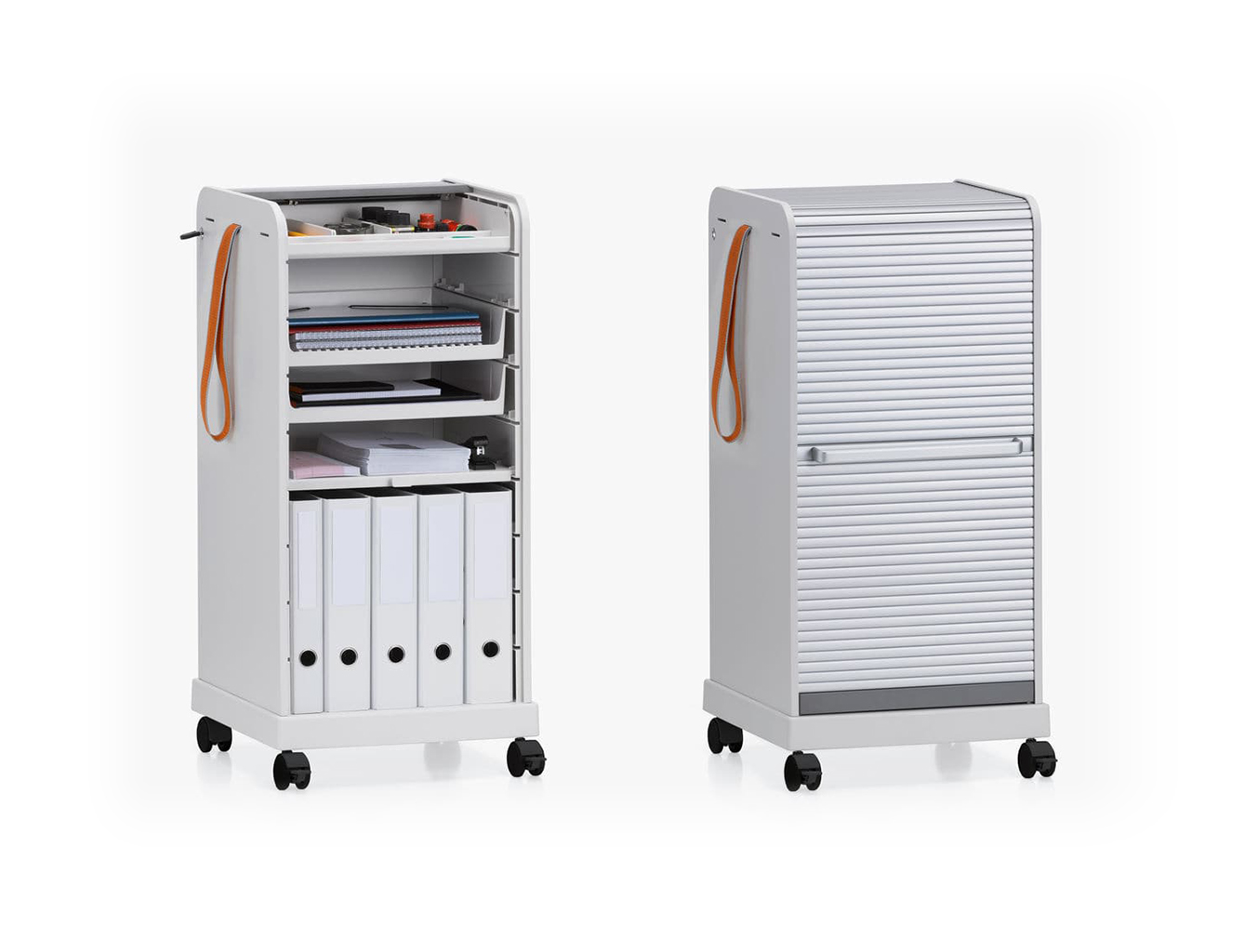 跟随我1和2是坚固,可锁定的移动基座,用于办公室和家庭。 装饰性拉带可以轻松地将手推车从一个地方移动到另一个地方。 一个(跟随我1)或两个(跟随我2)用于活页夹的货架空间和一个带有可移动托盘的集成存储隔间用于纸张和个人物品可以隐藏在移动基座的鼓形快门后面。 两种型号都可以单独配置可选的抽屉和搁板。 较高的Follow Me 2版本是站立高度表的理想伴侣。