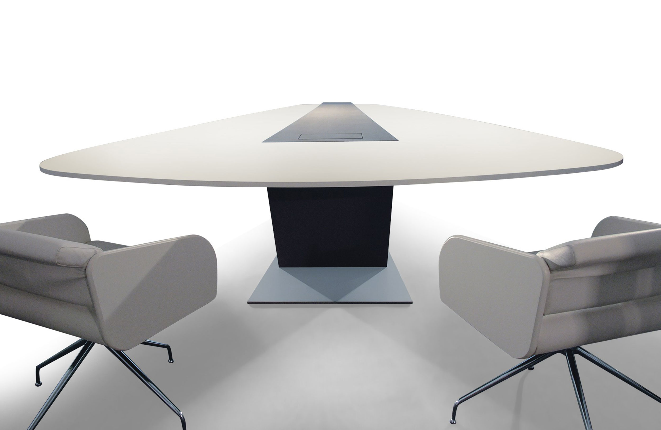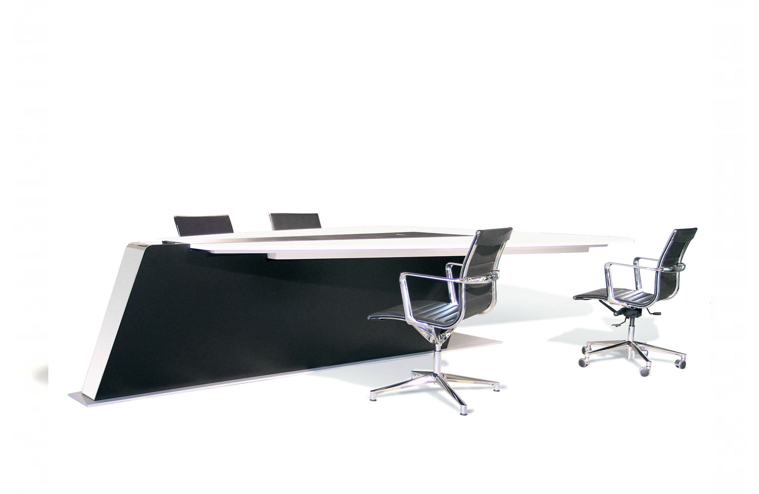 会议桌。水滴形顶部。它较窄的一端可能会召回一艘船的船。顶部分为三个平行区域,允许不同材料和饰面的组合。50mm厚的顶部由两部分组成:盖子和45o斜面底盖。表目的设计是进行预测,演示和多媒体会议。可选的集成伸缩式计算机监控系统,电缆管理和其他电子部件。倾斜的棱柱形底座由金属结构制成,金属结构固定在金属板上,并用可拆卸的面板封闭,可以方便地进入桌子内部,以便进行电缆管理和维护。表面处理:混合成品顶部采用木材,微纹理漆或Techno Leather软垫。以漆面为基础。