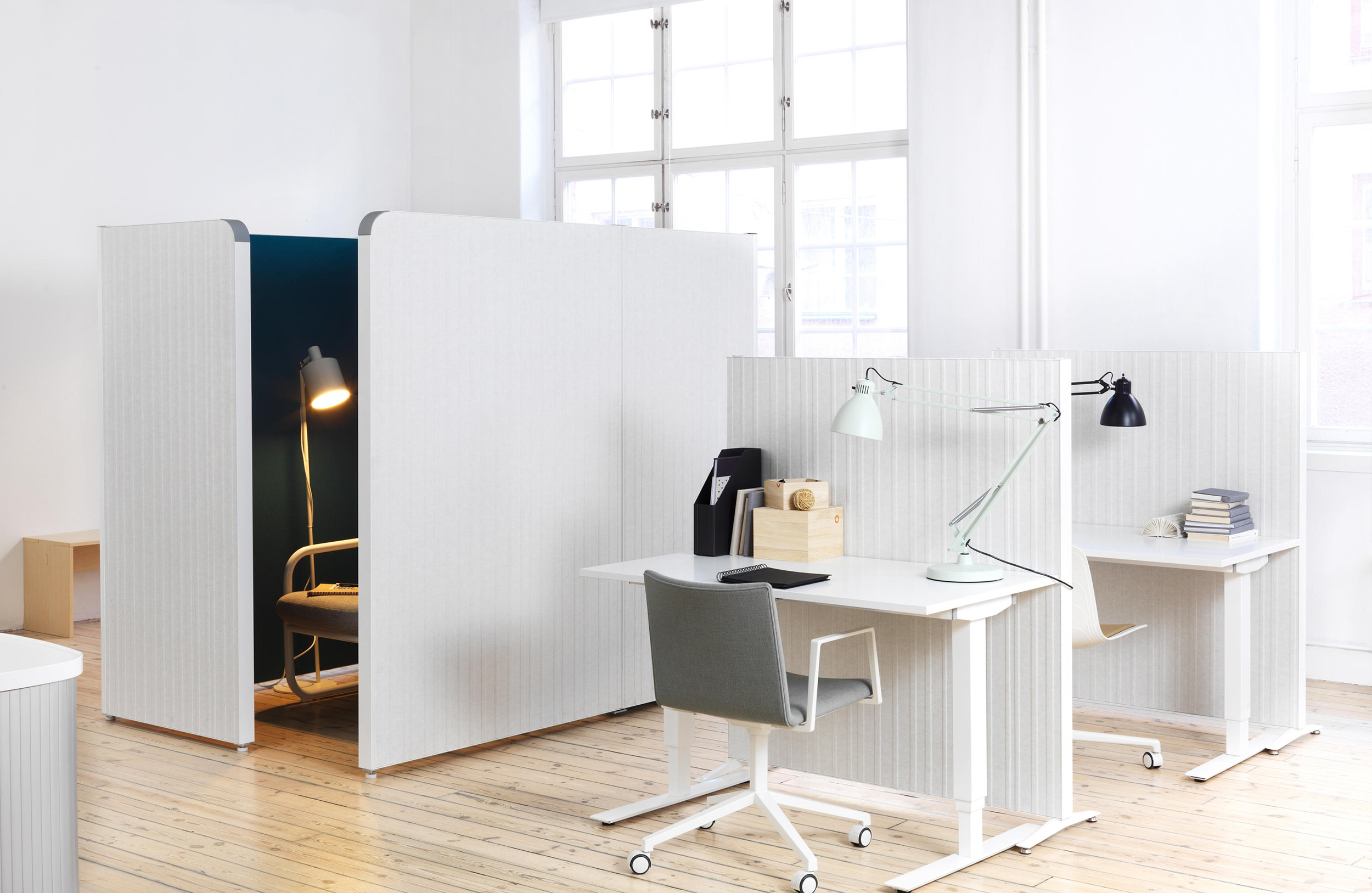 Nina Jobs设计了Alumi Combi和Alumi Combi Light,旨在鼓励同事随心所欲地召开会议。屏幕既可作为吸音器,也可作为书写板,安装在轮子上,便于携带。多功能书写板与Alumi系列中的其他吸音屏幕具有相同的低调外观,使它们能够和谐统一。