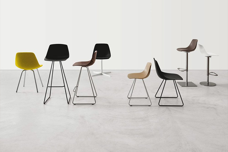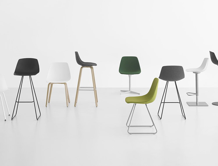 外壳由模压复合材料制成,并带有各种饰面的3D饰面板,或用皮革或织物装饰。框架带有中央支柱和交叉底座,四腿或雪橇框架,亚光镀铬或黑色或白色。凳子可提供与椅子版本相同或带有皮革覆盖的座套。它的高度可调或固定高度可用,立柱由喷砂不锈钢制成,镀锌底板覆盖有不锈钢板。