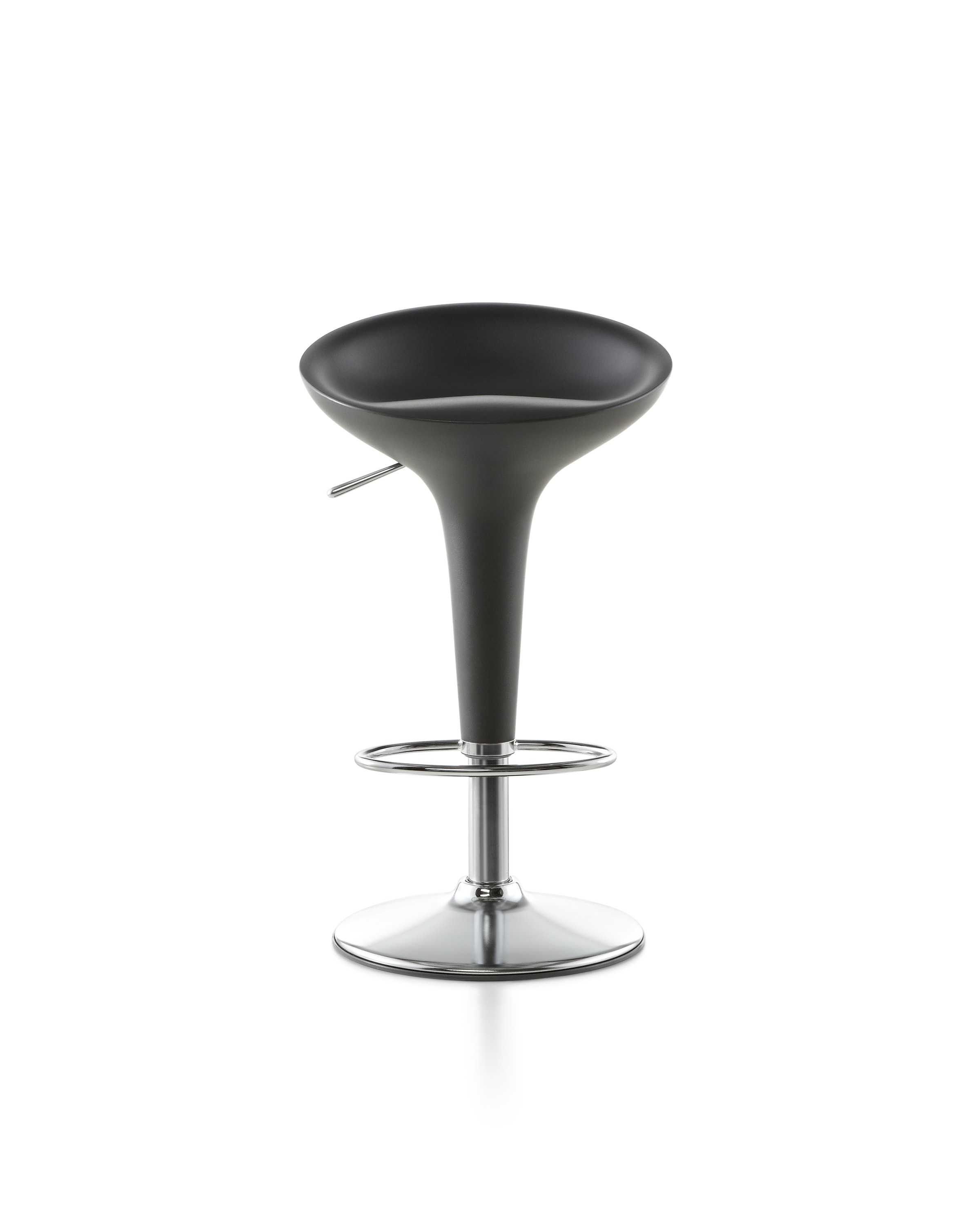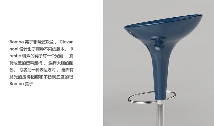 《星际迷航》(Star Trek)系列电视剧和电影《迷失太空》(Lost in Space)的片场都使用了这种未来感,最初的Bombo凳子改变了人们对凳子外观的看法。Stefano Giovannoni的华丽设计立即获得了评论界和商业上的成功。可提供一系列哑光色,座位旋转360度。