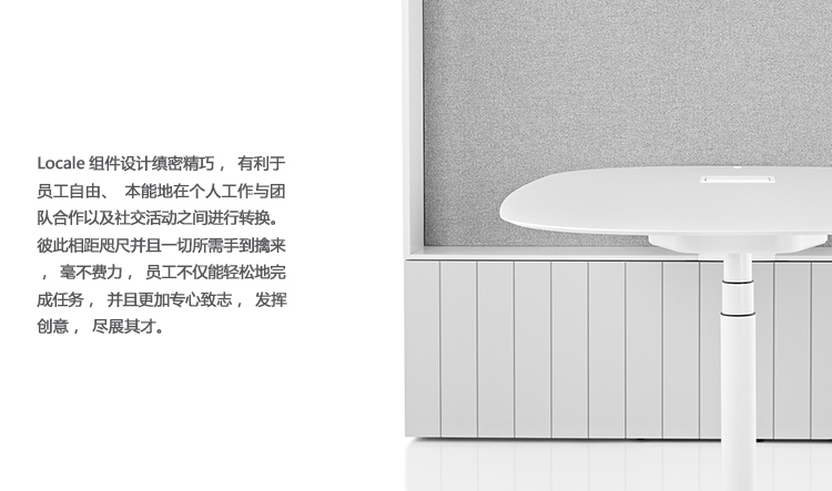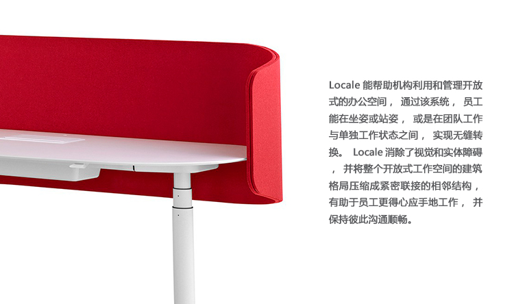 Locale能帮助机构利用和管理开放式的办公空间,通过该系统,员工能在坐姿或站姿,或是在团队工作与单独工作状态之间,实现无缝转换。Locale消除了视觉和实体障碍,并将整个开放式工作空间的建筑格局压缩成紧密联接的相邻结构,有助于员工更得心应手地工作,并保持彼此沟通顺畅。