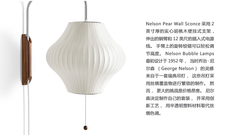 Nelson Pear Wall Sconce采用2英寸厚的实心胡桃木壁挂式支架,伸出的钢臂和12英尺的插入式电源线。 手臂上的旋转铰链可以轻松调节高度。 Nelson Bubble Lamps最初设计于1952年,当时乔治·尼尔森(George Nelson)的灵感来自于一套瑞典吊灯,这些吊灯采用丝绸覆盖物进行繁琐的制作。 然而,更大的挑战是价格昂贵。 尼尔森决定制作自己的套装,并采用创新工艺,用半透明塑料材料取代丝绸色调。
