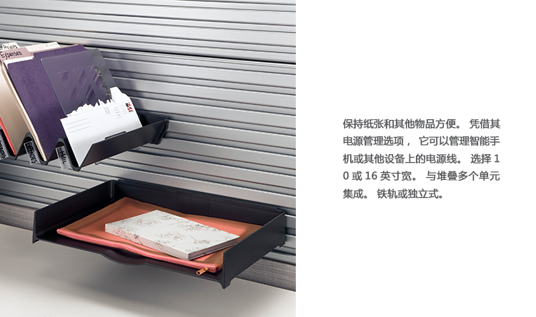 把文件和其他物品放在手边。有了它的电线管理选项,它可以管理你的智能手机或其他设备上的电线。选择10或16英寸宽。集成多个单元的堆叠。Rail-attached或独立。
