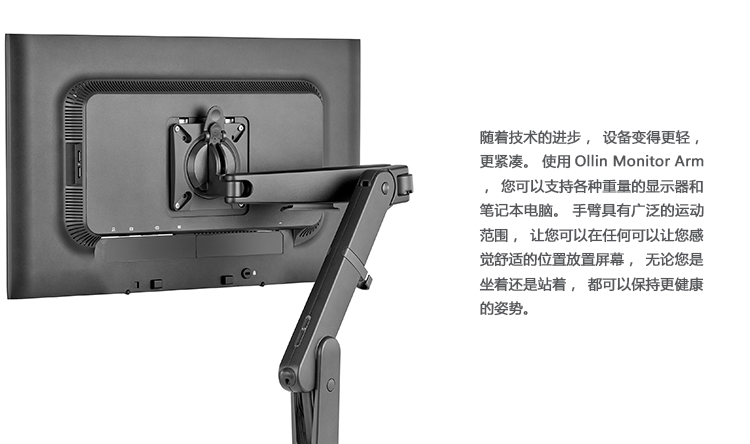 随着技术的进步,设备变得更轻,更紧凑。 使用Ollin Monitor Arm,您可以支持各种重量的显示器和笔记本电脑。 手臂具有广泛的运动范围,让您可以在任何可以让您感觉舒适的位置放置屏幕,无论您是坐着还是站着,都可以保持更健康的姿势。