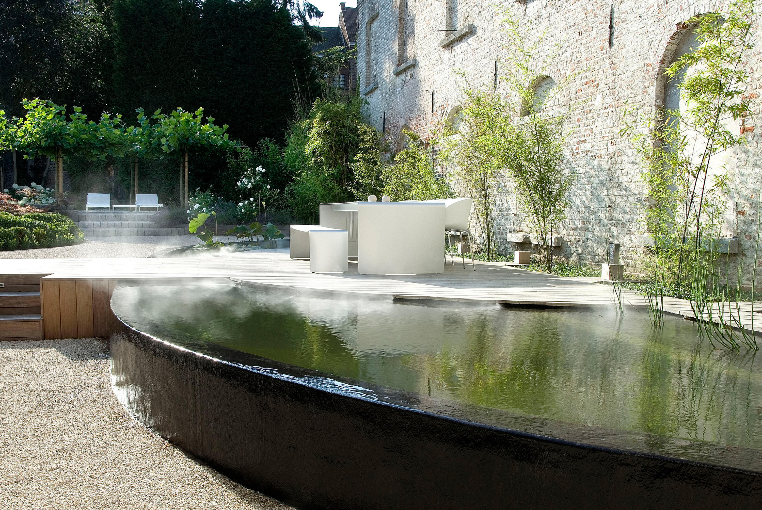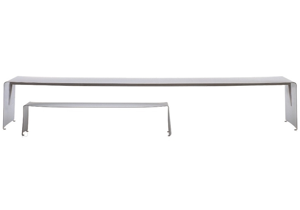 具有弯曲的自然铝片制成表。 表面处理: •铝涂漆 •亚光白漆 •光泽白漆 除了确保表的横向和纵向稳定性,加强梁(在高度70毫米使用表格240厘米,高度95毫米(更大的尺寸)和支撑的L形轮廓使得可以根据尺寸制造厚度不同的零件,从而在视觉上进一步改进它们:在80厘米宽的桌子中,铝厚度为5毫米,在90厘米宽的情况下表中的铝厚度为6mm。 身高73厘米。最大长度4.40米 室外使用 该表也适用于室外。