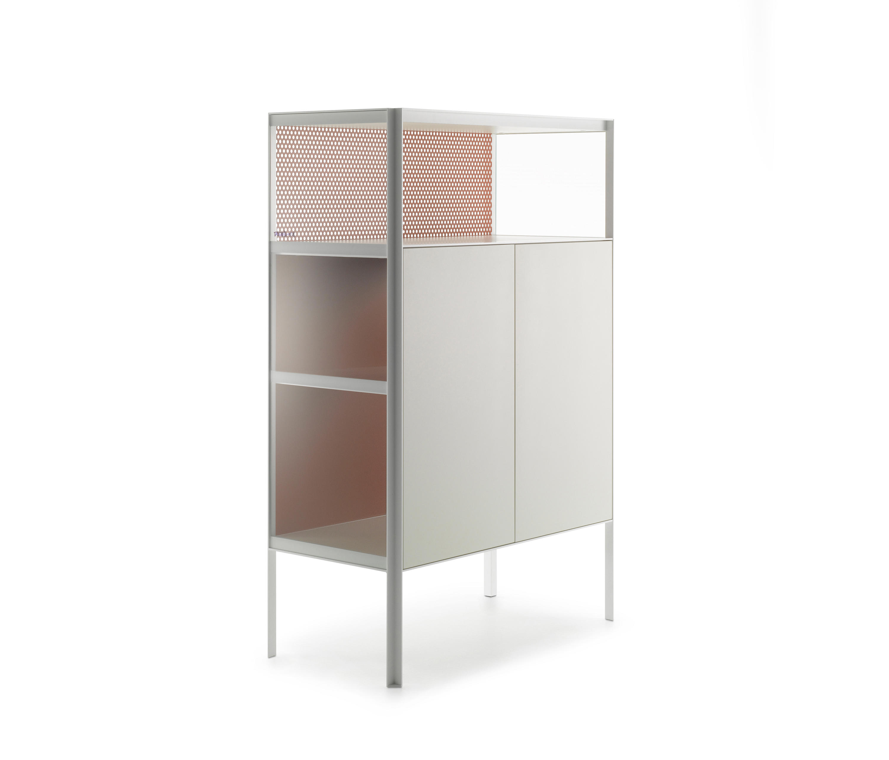 带有门,抽屉和开放式隔间的储物单元系统,适用于不同的家庭,办公室和公共环境。根据尺寸组合和正面设备,由不同储物单元组成的集合: -低L200 D50 H80厘米。可提供4门或2门,一个抽屉和一个开放式隔间,或两个门和一个双抽屉; -中号L151 D50 H116厘米。提供3门或3门和一个开放式隔层。 -高L103 D50 H152厘米。提供2门或2门和一个开放式隔层。 开放式隔间始终配备有带孔的靠背。 每个存储单元均可通过在两个侧面板的选项之间进行选择来定制: -透明的超透明玻璃,厚度为5mm -封闭,面板与结构的漆面相同。