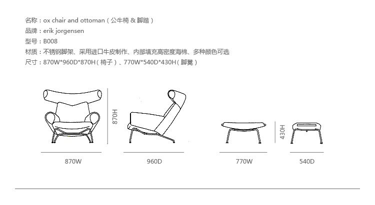 OX Chair (公牛椅)系列由丹麦著名设计师Hans J. Wegner在1960年设计的,系列包括OX Chair (公牛椅)、OX Ottoman(公牛脚踏)及其组合OX Chair and Ottoman(公牛椅&脚踏)。公牛椅系列收到毕加索作品的启发,设计了这款个性椅子。公牛椅是阳刚之气的本质,它表现出Hans J. Wegner设计少有的严肃的一面,它时尚而又实用,无论是家中还是办公场所都能安装,它让Hans J. Wegner的设计走向世界,也成为丹麦家具设计的经典之作。