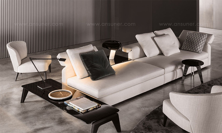 沙发的围裹式靠背特色十足,扶手线条与之完美呼应,以蓝灰色调呈现的压铸铝合金支脚尽展精致设计之美。