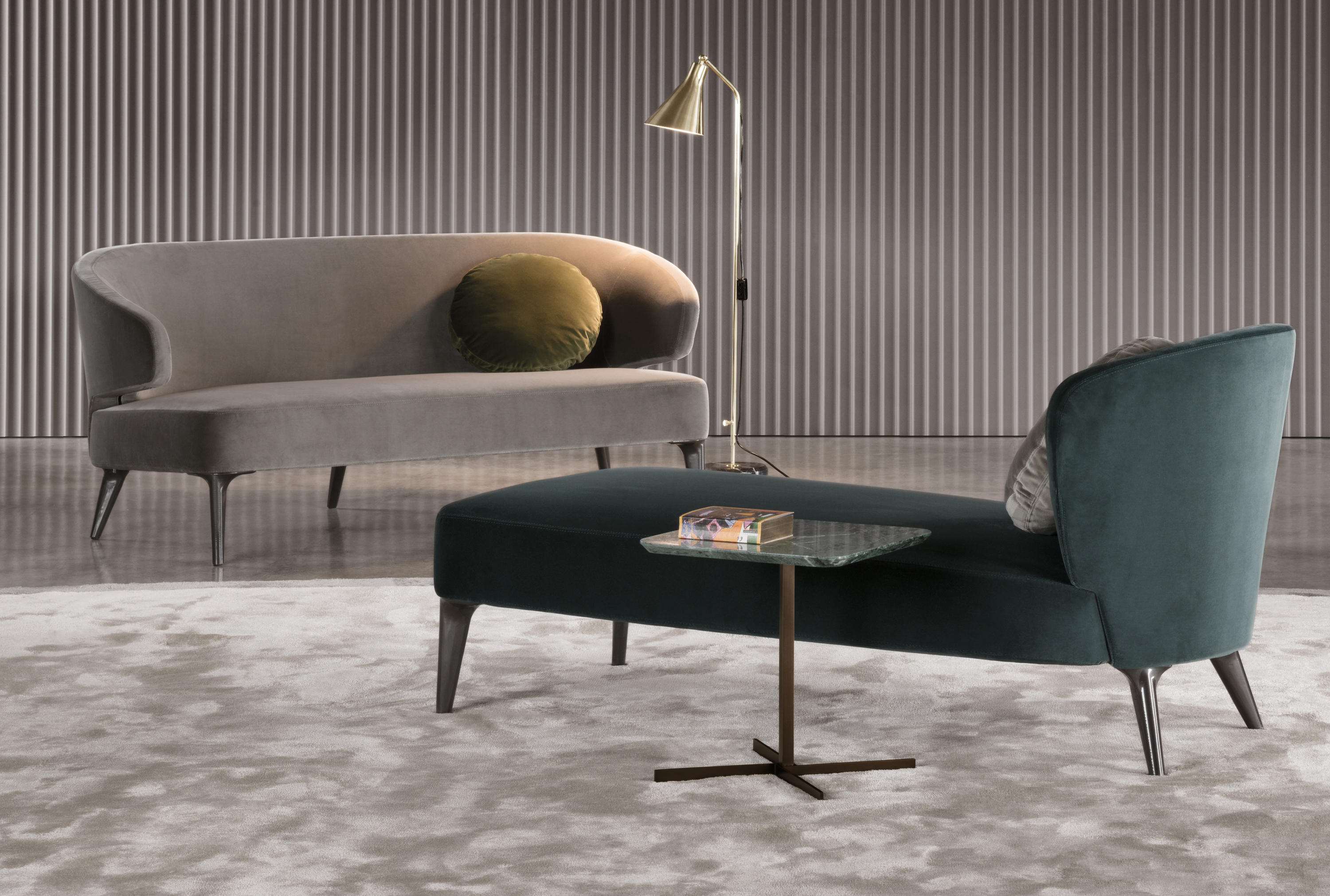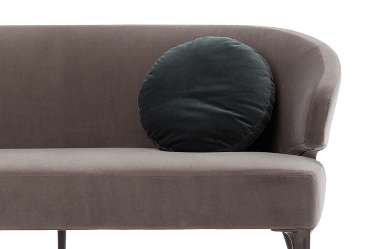 沙发的围裹式靠背特色十足,扶手线条与之完美呼应,以蓝灰色调呈现的压铸铝合金支脚尽展精致设计之美。