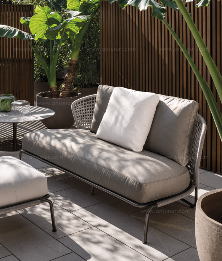 Aston是一个单品家族系列,其中包括沙发、沙发床、扶手椅、脚凳、座椅,为家居环境和“共享空间”提供优雅而时尚的装饰,在室内和室外皆可应对自如。阿斯顿“绳”户外系列采用金属材质的构架,搭配Pewter色聚酯漆面,部件都针对户外环境而经过特别处理,覆面采用疏水性纤维面料。靠背采用直径为7毫米的特殊聚丙烯纱线编织而成,两种颜色可供选择:浅灰色和深棕色,与全新Art Lifescape 02系列的面料和Alison “Dark Brown”户外系列的色调相得益彰。针对户外环境的特点,金属构架经过特别处理,搭配Pewter色聚酯漆面,覆面采用特殊聚丙烯纱线编织而成,有两种颜色可供选择:浅灰色和深棕色。坐垫采用Minotti Studio独家设计并通过激光加工而成的几何装饰。靠垫的内部填充物是高弹性聚氨酯泡沫,覆面采用疏水性纤维面料。