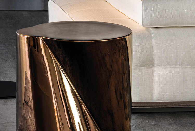 两个锥体连接在一起,打造出造型别具一格的边几,与此同时,两种金属饰面也体现出这款产品的非凡气质:铜色和铂金色。在经过玻璃化的工序之后,陶瓷还要经过进一步烧制,以此来熔化釉面的金属。