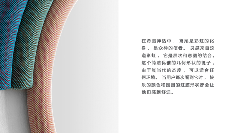 在希腊神话中,Iris(鸢尾)是彩虹的化身,是众神的使者。灵感来自这道彩虹,它是层次和意图的结合。这个简洁优雅的几何形状的镜子,由于其当代的态度,可以适合任何环境。当用户每次看到它时,快乐的颜色和圆圆的虹膜形状都会让他们感到舒适。