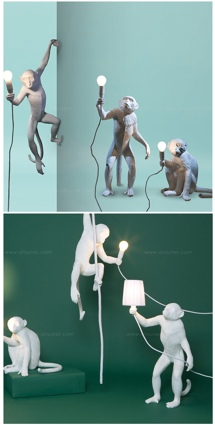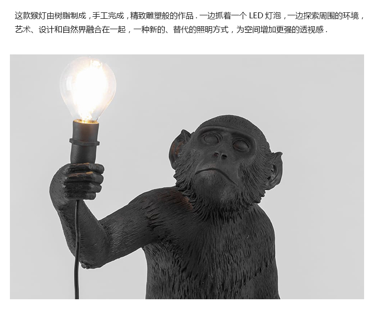 这款猴灯由树脂制成,手工完成,描绘了一只猴子在三个不同的位置,一边抓着一个LED灯泡,一边探索周围的环境,一种新的、替代的照明方式。