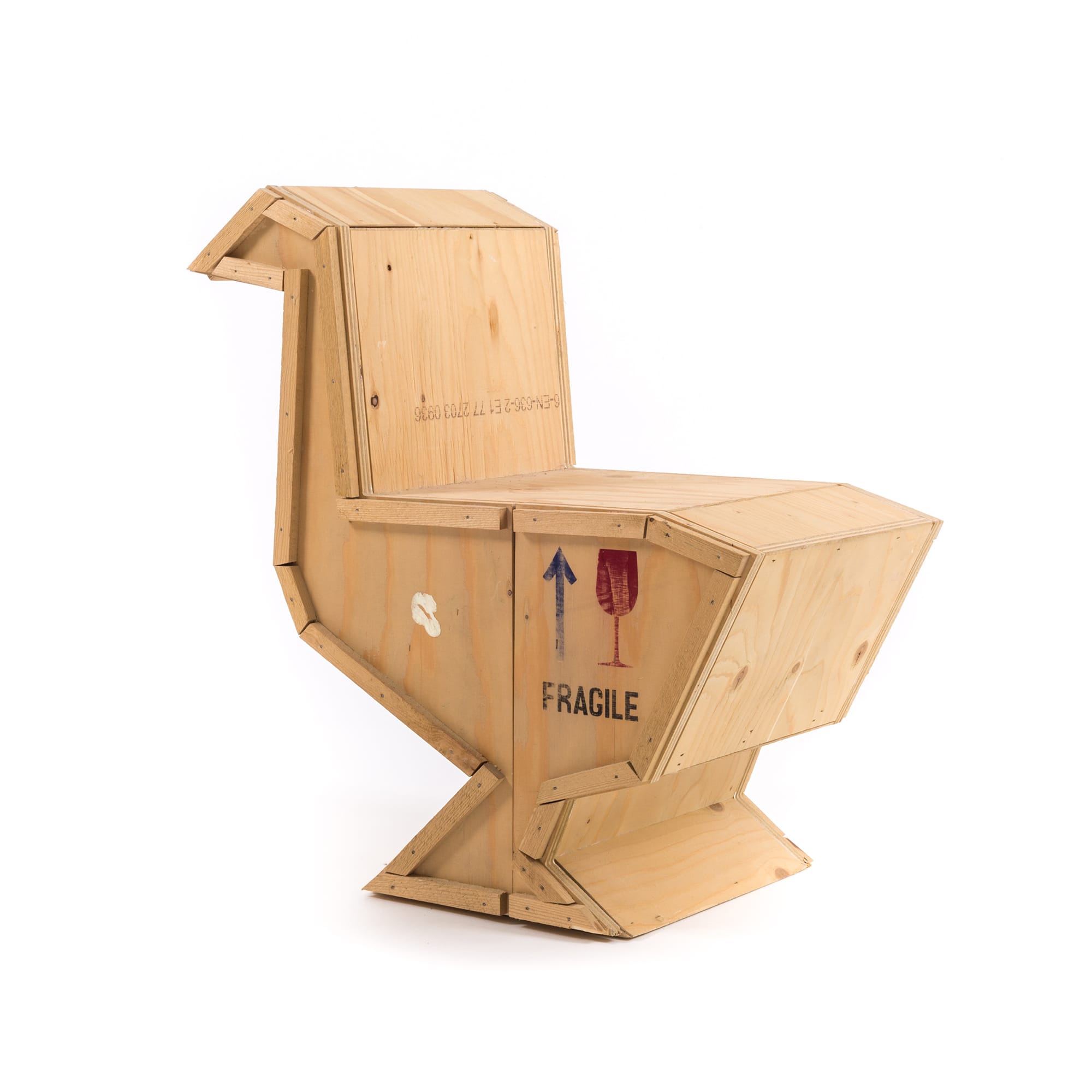 讽刺是一件严肃的事情,如果在微笑的同时让我们思考。动物板条箱协会很有趣,但同时也让我们对人类与自然的关系感到敏感。这件家具作品代表了一种荒谬的形象,动物们被运来运去。可能吗?为了更好地表达这个概念,我们选择了三种典型的农场动物,一头牛,一头猪和一只鸭子。每一个可见的瑕疵都是这件作品的特色,为了尊重原作的诗意,这些作品都是用同样的工艺制作而成,用于真正的运输板条箱。
