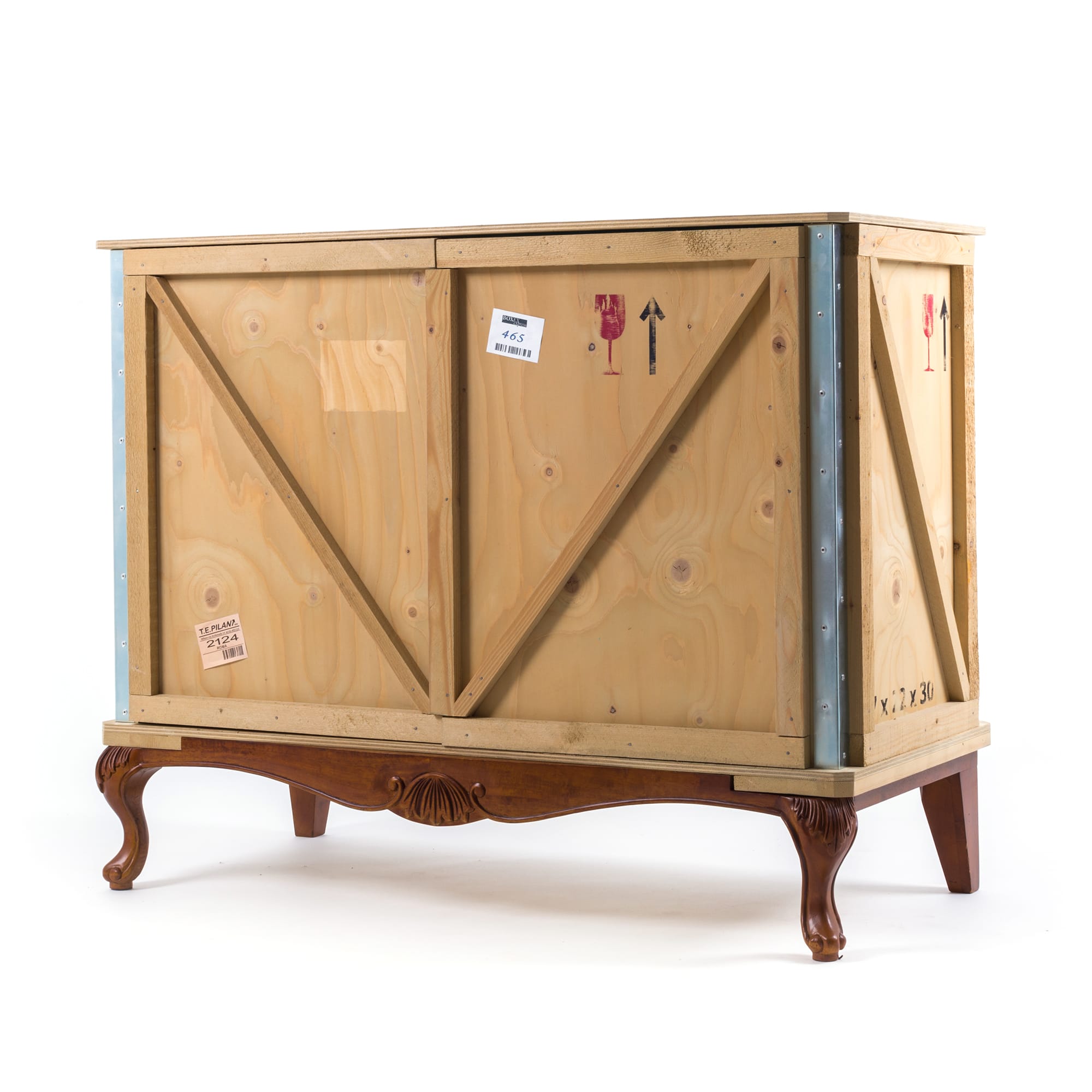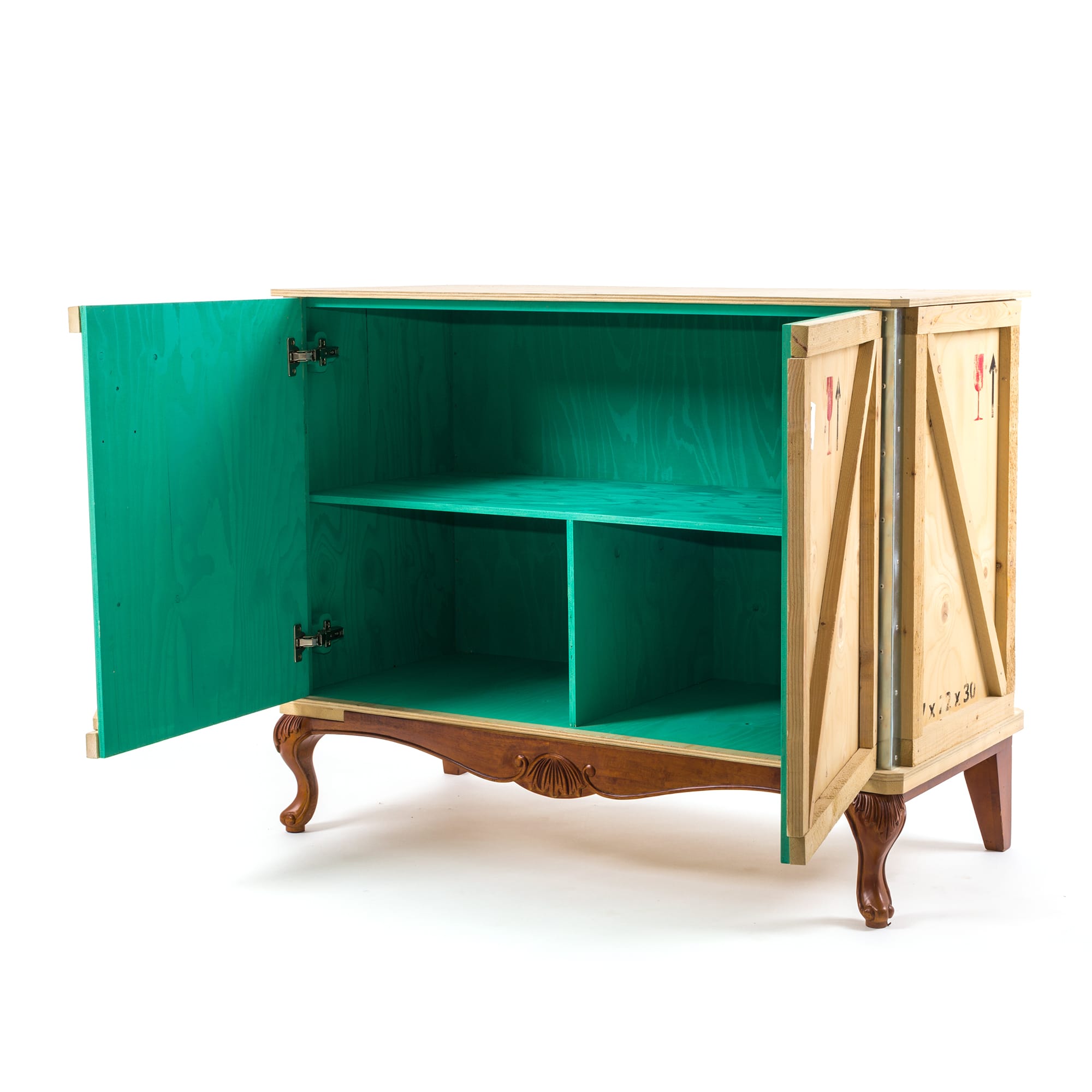 Designed by Marcantonio Raimondi Malerba for Seletti, this modern bedside table blends two different styles in one quirky design. A packing case boasting various labels and signs is paired with ornate Louis XIV legs. The bright green interior features one shelf and two storage spaces. Handmade from solid wood, this Export Como Bedside Table is as impressive in its durability as it is in its distinctive design. It can be used on its own to create a focal point in a bedroom or alongside other pieces of furniture from the Export Como collection. Made in Italy.