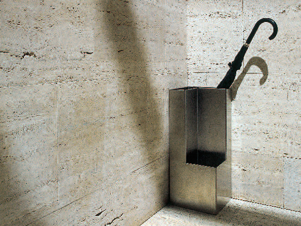 整洁和储存不同尺寸的雨伞。所述的形状PLEC是理想用于使最机构的那些浪费空间隐藏在角上。在钢与压花银kataphoretic治疗结束或抛光和半无光不锈钢。底部有聚醚泡沫。铝和钢制铆钉。硅密封碗。