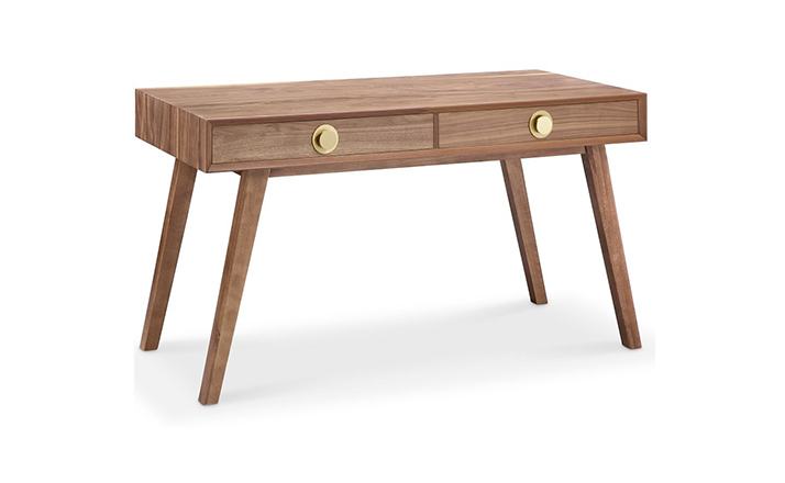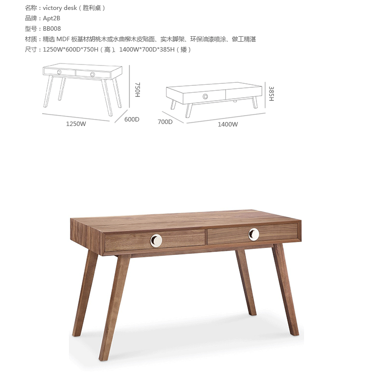 victory desk(胜利桌)设计简单、坚固且绝对的迷人,所设计的两个抽屉可以为你存储所有小物品。制作采用精选MDF板基材胡桃木或水曲柳木皮贴面、实木脚架、环保油漆喷涂,做工精湛,品质一流。