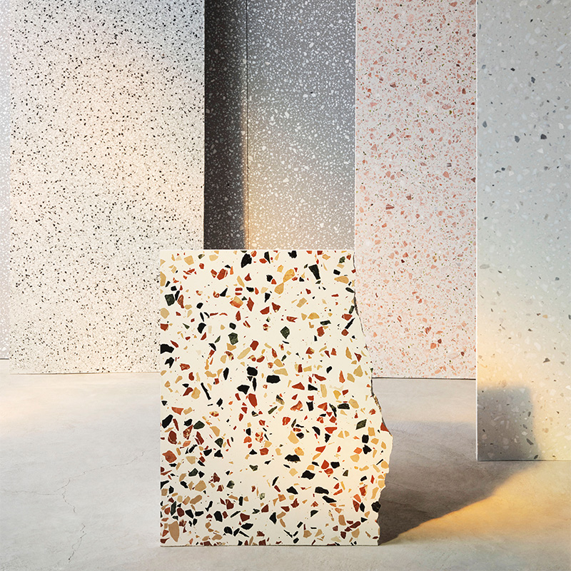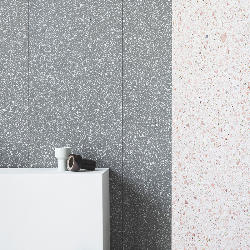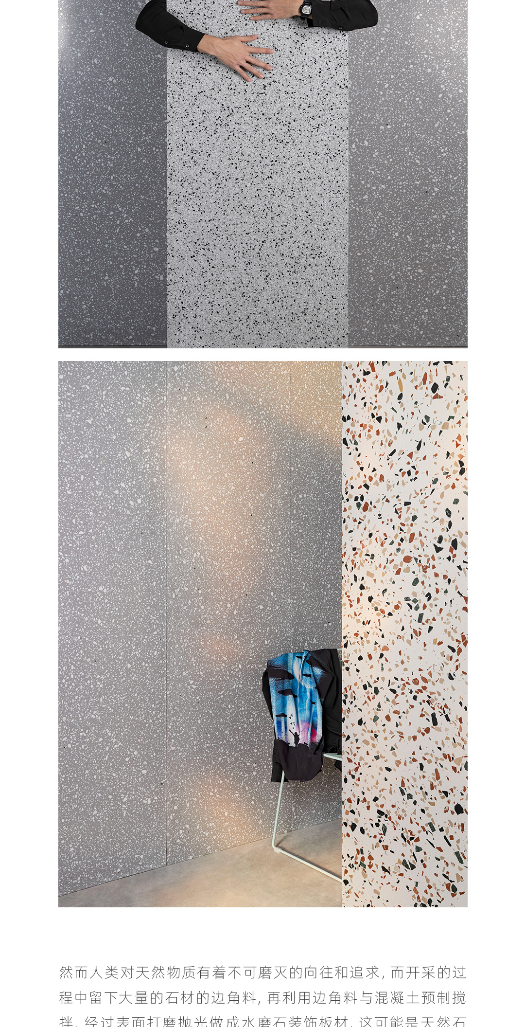 随着天然大理石材不合理开采,社会环境的可持续生态逐渐恶化! 然而人类对天然物质有着不可磨灭的向往和追求,而开采的过程中留下大量的石材的边角料,再利用边角料与混凝土预制搅拌,经过表面打磨抛光做成水磨石装饰板材,这可能是天然石材的挽歌,也是作为地球公民对社会自然生态可持续发展作出的一些探索。