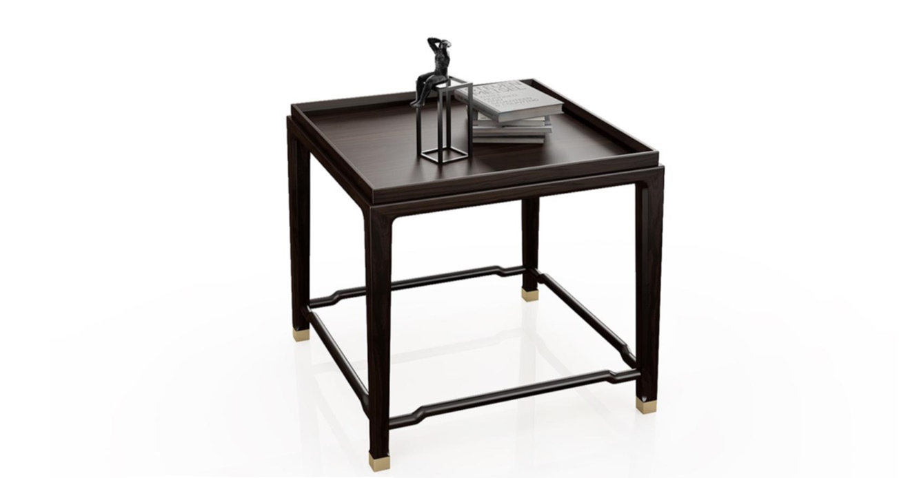 1.茶几整体简洁干练,茶几面四周向上凸出,可防止物品滑落。 2.茶几腿部采用明式家具经典构件罗锅枨,超逸空灵。 3.铜脚设计,赋予中式韵味的同时以防磨损。
