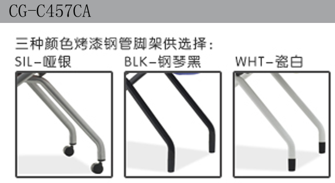 5、椅脚:黑色烤漆弓形脚架,牢固耐用、不易脆裂,承受力度強。弓形脚架上安装耐磨性極好的PU脚垫,在使用過   程中適合與多種材質的地板。