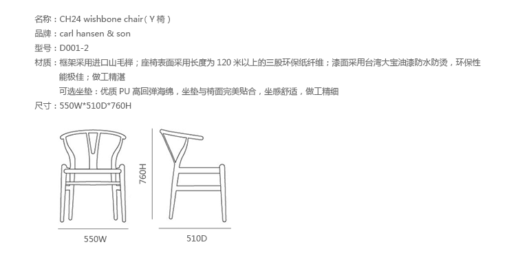 Y椅子是Hans J.Wegner最著名的作品。 它具有重量轻、有吸引力、舒适、中式风格等特点。 该款设计灵感来源于中国传统家具,四平八稳,古色古香,大气自然。上圆下方,浑然天成,深受中国顾客喜欢。Y椅关键在于是工艺与简约的设计,有着清晰的线条。 尽管椅子简约的外观要超过100个步骤进行。除其他事项外,手工编织座垫超过120米的线。 材料有丹麦硬木(橡木,榉木,水曲柳)以及北美硬木(胡桃木,樱桃木)等。外表可漆成各种各样的颜色。 垫子的座位可以添加额外的舒适。