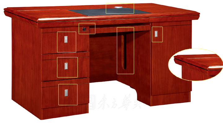 ※  上图将此款职员台精湛的细节部位另行罗列,例如隐藏式铝合金拉手,按下拉出,实木的收纳式键盘架,镶嵌式梯形皮垫,台面双色分线条,跑道型过线孔,功能齐全!