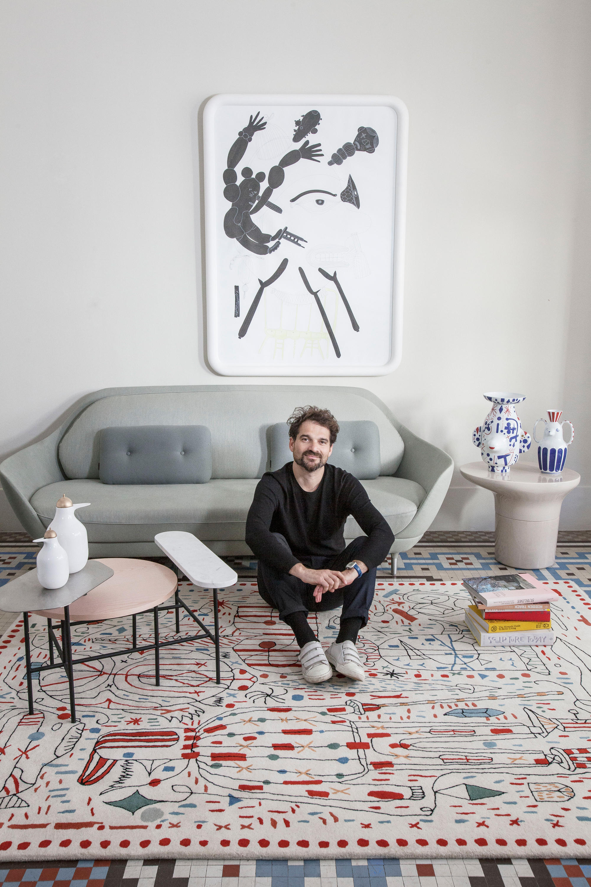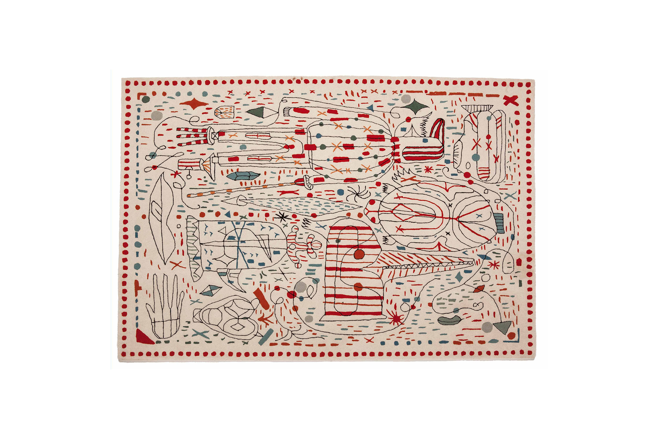 第一眼看到的是一片混乱的颜色和形状,它们侵入了地毯。然而,在仔细看,Jaime海因弹簧的想象力生活:海龟、嘴唇,手,凳子,鱼,男人等等...
