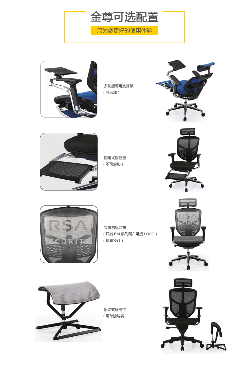 金尊的唯美设计有利于持久的舒适和美感。人性工学椅的结构和功能利用同步倾仰底盘控制功能锁定,滑座和高度调节。高度和角度均可调的扶手和头枕都包含在这张独一无二的工学椅里。