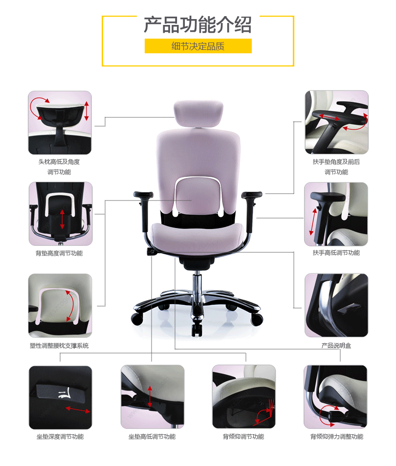 金爵系列采用独特的分离式腰枕设计,并使用塑胶的特性达成调整的功能,提供使用者最佳的腰部支撑。