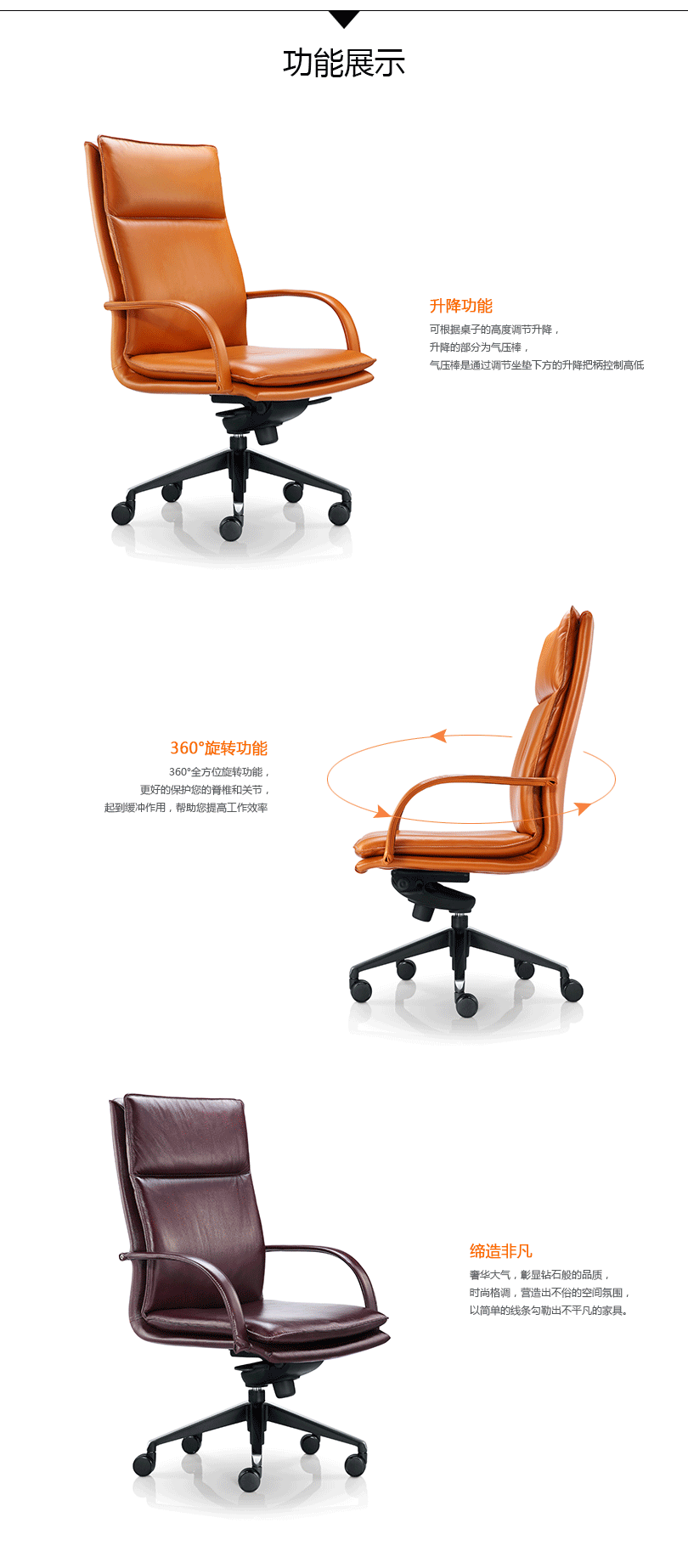 奢华大气,彰显钻石般的品质,时尚格调,营造出不俗的空间氛围,以简单的线条勾勒出不平凡的家具。360°全方位旋转功能,更好的保护您的脊椎和关节,起到缓冲作用,帮助您提高工作效率。