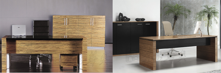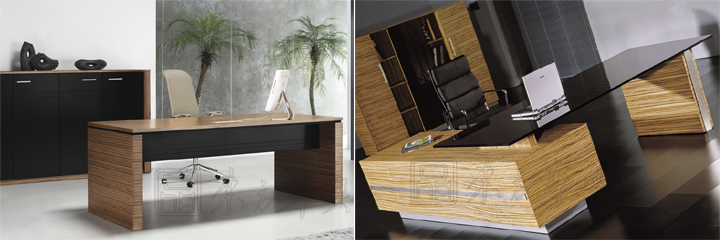 ※ 上图为大班台不同角度的展示,突出每个细节做工的精细,台面可以选做黑色烤漆钢化玻璃和中纤板实木面,斑马纹封闭漆,纹理漂亮而雅致,斑马纹非常亮眼,是很引人注目的室内设计元素,与黑色搭配更显现代潮流风格。