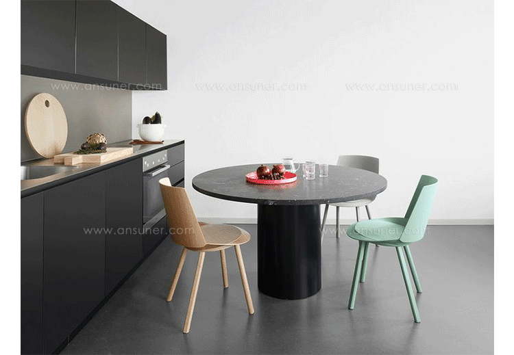Mainzer 的hiroki dining table(hiroki 餐桌),Philipp Mainzer的作品,设计基于他成功的金针菇边几系列,hiroki 餐桌更像金针菇边几的改良版,加大了台面宽度,减小了立柱直径,使之成为合适的餐桌。造型和选材都与金针菇边几一样,还扩大了新材料的运用,采用天然大理石或中纤板贴木皮台面、台脚为全实木(颜色多选)Hiroki 餐桌旁钢圆柱基础有十一种涂漆颜色可选,包括信号白、乌黑,交通灰色、淡蓝色、绿色、棕色,蜜黄色、影灰色、薄荷绿、海军蓝色、米色红色,火焰红等。