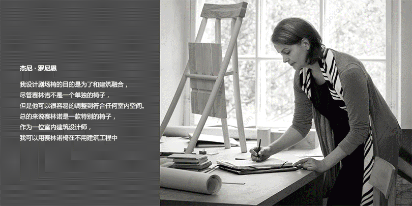 关于这款椅子,设计师说我的目的是要设计一款能融入建筑的剧场椅,赛林诺不是一款单独的椅子,由于它的特殊形式,它适合不同的室内环境。