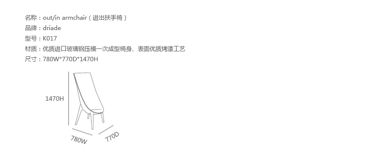 "代表个人化贵族生活的居家生活品牌非Driade莫属,Driade的每件家具皆具有原创性与独特性,充分彰显收藏者的品味与眼光,其独一无二的空间主体性,既凸显家具本体,又能凝聚并调和空间中所有元素,使其能成为任何设计风格之最佳点缀。Driade极力展现其品牌在家居市场扩展的雄心。每一件商品都是当今知名设计师的创意产生的。Driade自1968年创立以来,不断以提升居家生活美学为目标,致力于持续改革全系列家具,四十年来的自我鞭策,造就Driade今日引领世界家具设计潮流的领导地位。由鬼才设计大师Philippe Starck与Driade合作的Out/In高背座椅,展现极具现代感的设计理念。令人玩味的造型,让居家生活增添更多趣味,绝佳的舒适支撑度,又让人十分自在放松。德利雅德于美感品味的精准掌握,以及对生活趣味的创意发想,无疑是德利雅德在设计领域竖立鲜明旗帜的主要原因。Out/In高背座椅有黑,白,银灰等颜色可供选择。