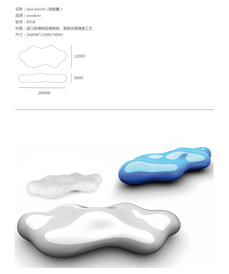 LAVA, 是美国设计奇才KARIM RASHID 为西班牙品牌VONDOM设计的最新产品,是美丽,奢华 和功能性天衣无缝的搭配。 LAVA,一个起伏流云状的长凳,就象是一件完美的雕塑品。其前卫的和自然的形状为任何室内室外空 间创造一个愉快,自然,放松的聚集点。又能使家具和使用空间自然的融为一体。 如果想为此空间创造一个更特别的效果,我们可以在 LAVA 内置节能灯或者RGB LED。这个搭配无 疑将谁观察它都会因此而着迷 ...