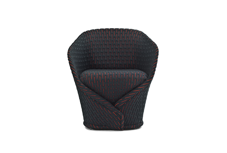 伪装成休闲椅的扶手椅,用他们的外表来控制空间。这主意很简单,用一件有衬垫的大衣盖住金属框架然后把它变成别的东西。一种非常直立的姿势,扶手的形状让人联想到双排扣外套的翻领,而这种相似之处就在中央扣扣上。室内装潢变成了衣服,可以在不过度的情况下,将赤裸的身体转变成一种追求自身内在同一性的物体。