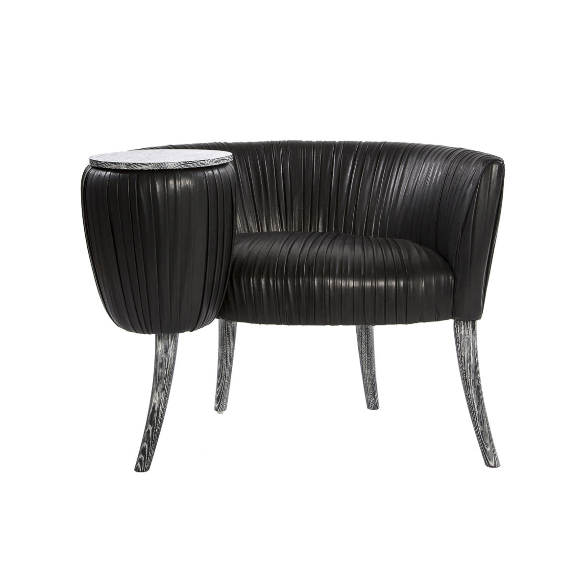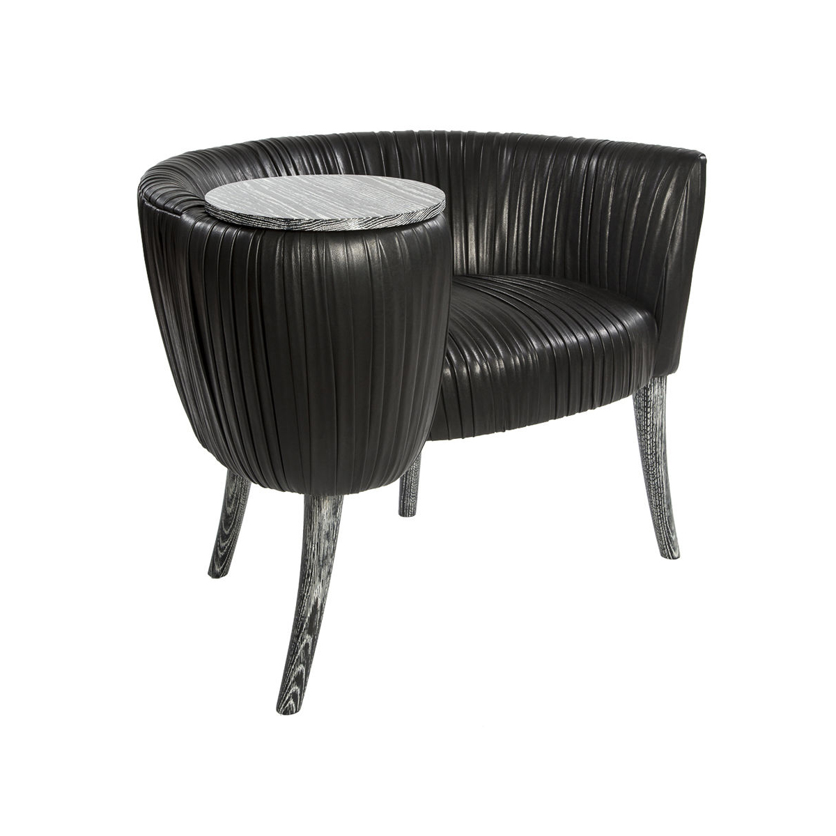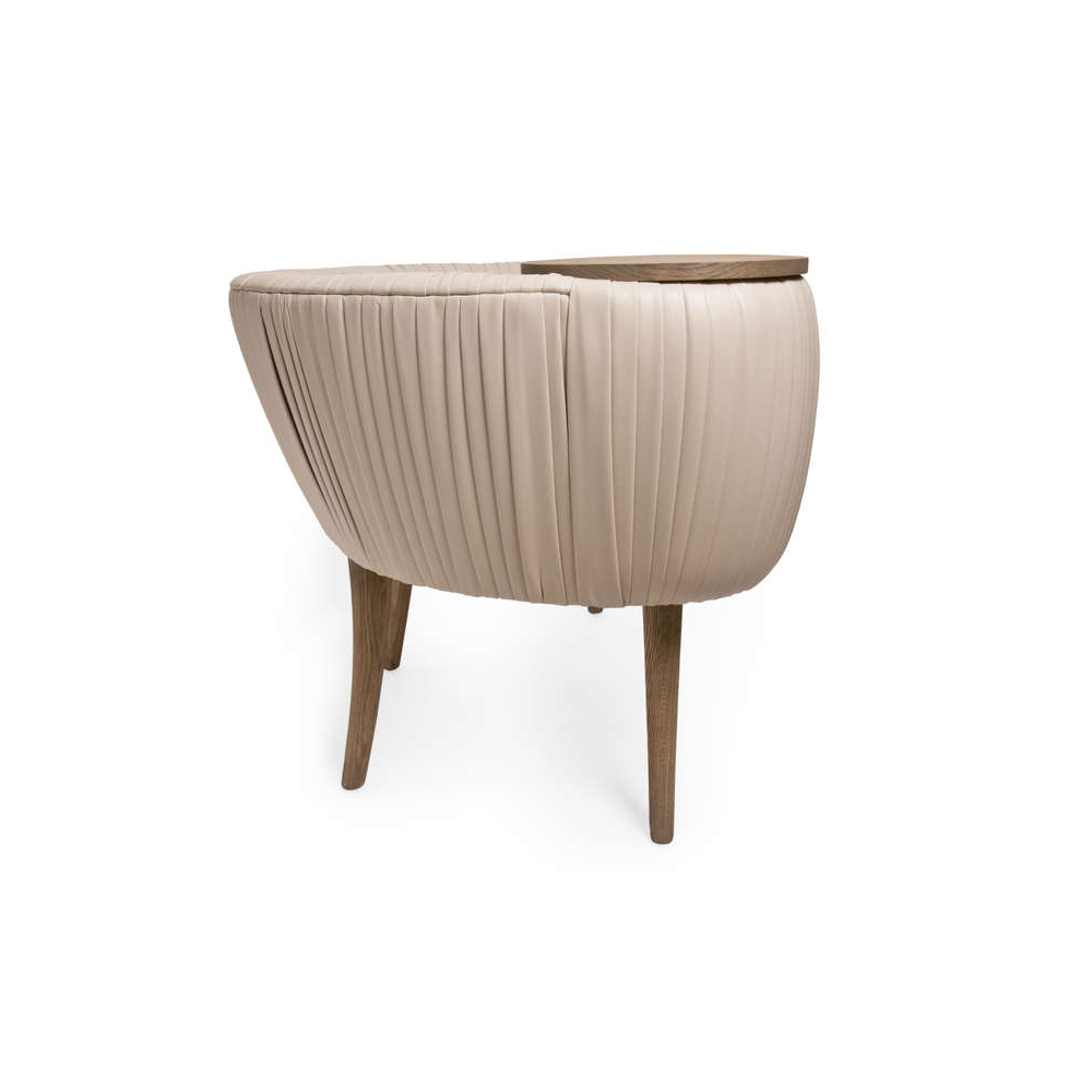 这款椅子的精致线条采用标志性皱折皮革细节设计。 这款精美细腻的椅子有一个小的附着的桌面和锥形腿,全部由手工橡木制成。