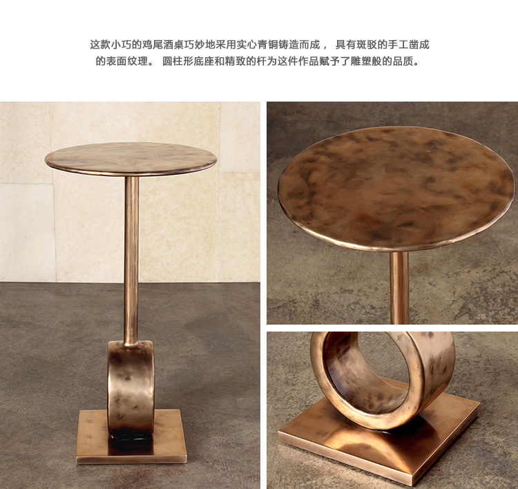 这款小巧的鸡尾酒桌巧妙地采用实心青铜铸造而成,具有斑驳的手工凿成的表面纹理。 圆柱形底座和精致的杆为这件作品赋予了雕塑般的品质。