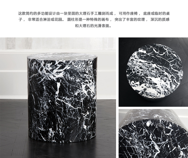 这款简约的多功能设计由一块坚固的大理石手工雕刻而成,可用作座椅,底座或临时的桌子,非常适合淋浴或花园。 圆柱形是一种特殊的画布,突出了丰富的纹理,深沉的质感和大理石的光滑表面。