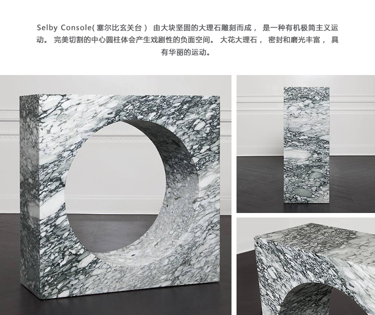 Selby Console(塞尔比玄关台)由大块坚固的大理石雕刻而成,是一种有机极简主义运动。 完美切割的中心圆柱体会产生戏剧性的负面空间。 大花大理石,密封和磨光丰富,具有华丽的运动。