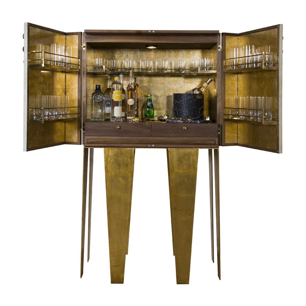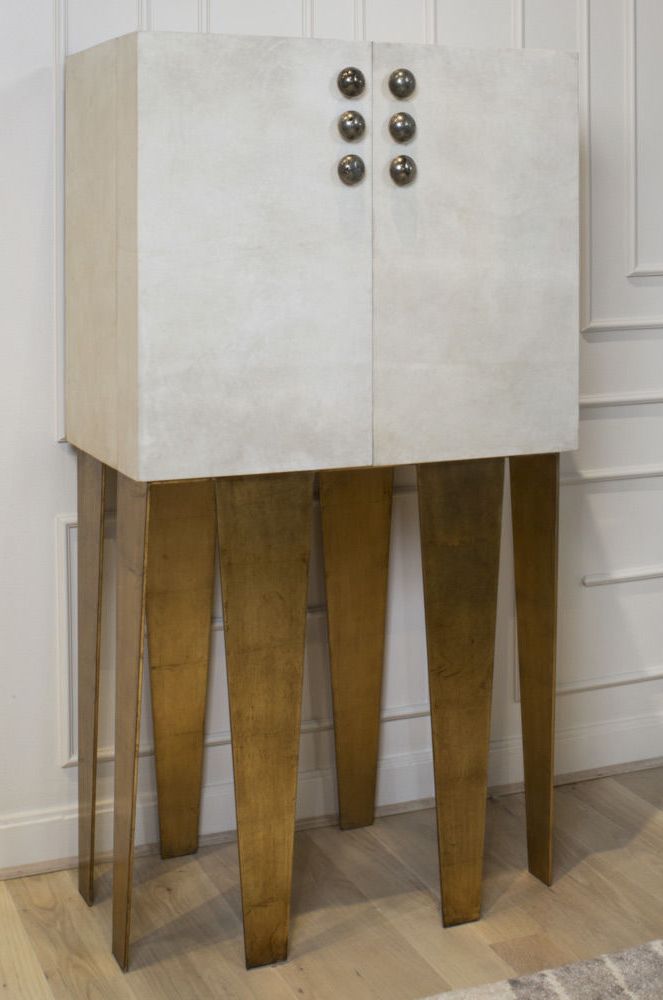 格里菲斯柜子装饰有手工挑选的半月形黄铁矿石,镶嵌在优雅的青铜框架中。 黑色或抛光的青铜色饰面交替出现,凸显了凯莉对混合金属色彩和原始自然细节的亲和力。 钢底座,羊皮纸外包装和天然胡桃木内部抽屉。