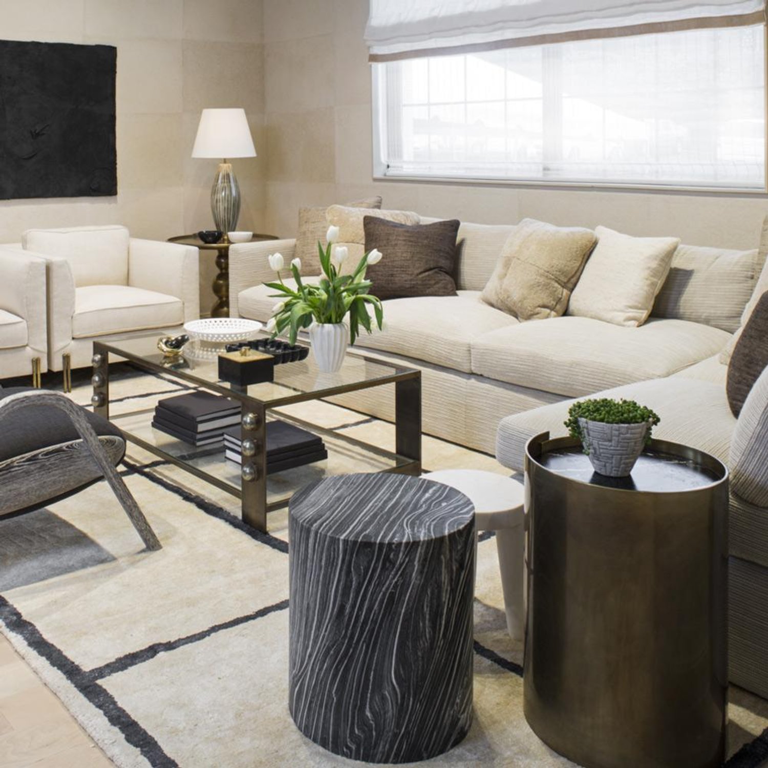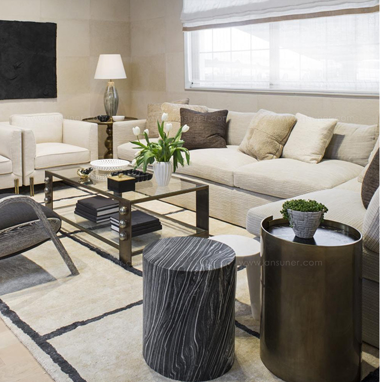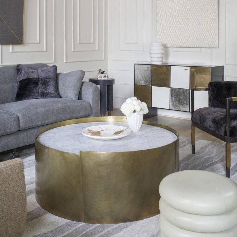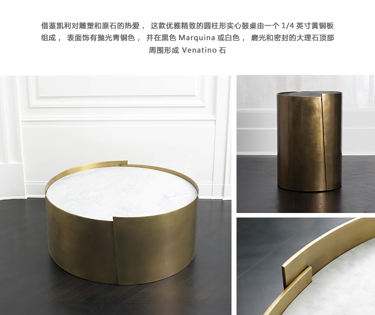 借鉴凯利对雕塑和原石的热爱,这款优雅精致的圆柱形实心鼓桌由一个1/4英寸黄铜板组成,表面饰有抛光青铜色,并在黑色或白色Marquina,磨光和密封的大理石顶部周围形成 Venatino石。 该设计具有微妙的重叠形状,为悄然标志性的轮廓增添了趣味和特色。