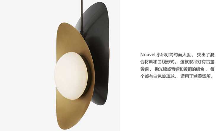 Nouvel小吊灯简约而大胆,突出了混合材料和曲线形式。 这款双吊灯有古董黄铜,抛光镍或青铜和黄铜的组合,每个都有白色玻璃球。 适用于潮湿场所。
