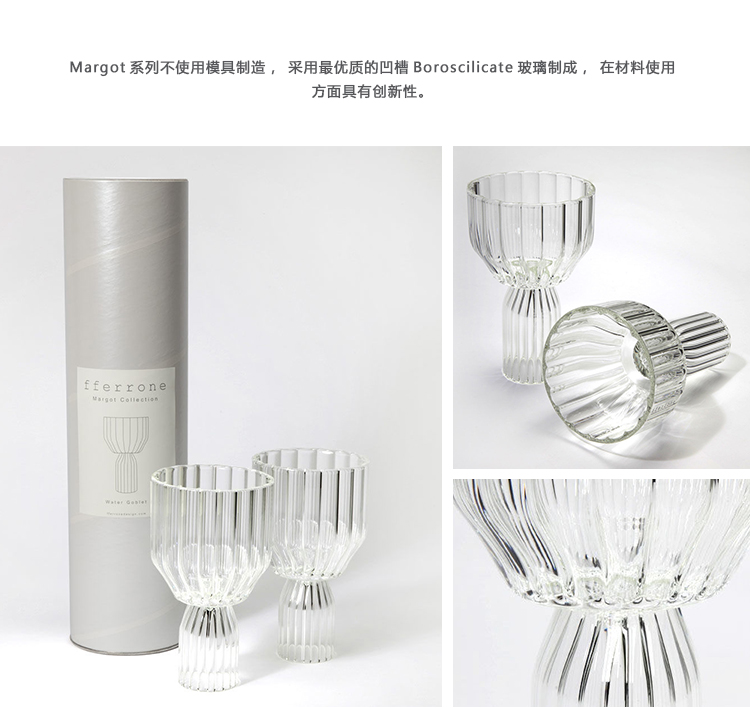 Margot系列不使用模具制造,采用最优质的凹槽Boroscilicate玻璃制成,在材料使用方面具有创新性。