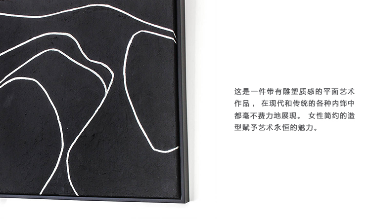 这是一件带有雕塑质感的平面艺术作品,在现代和传统的各种内饰中都毫不费力地展现。女性简约的造型赋予艺术永恒的魅力。